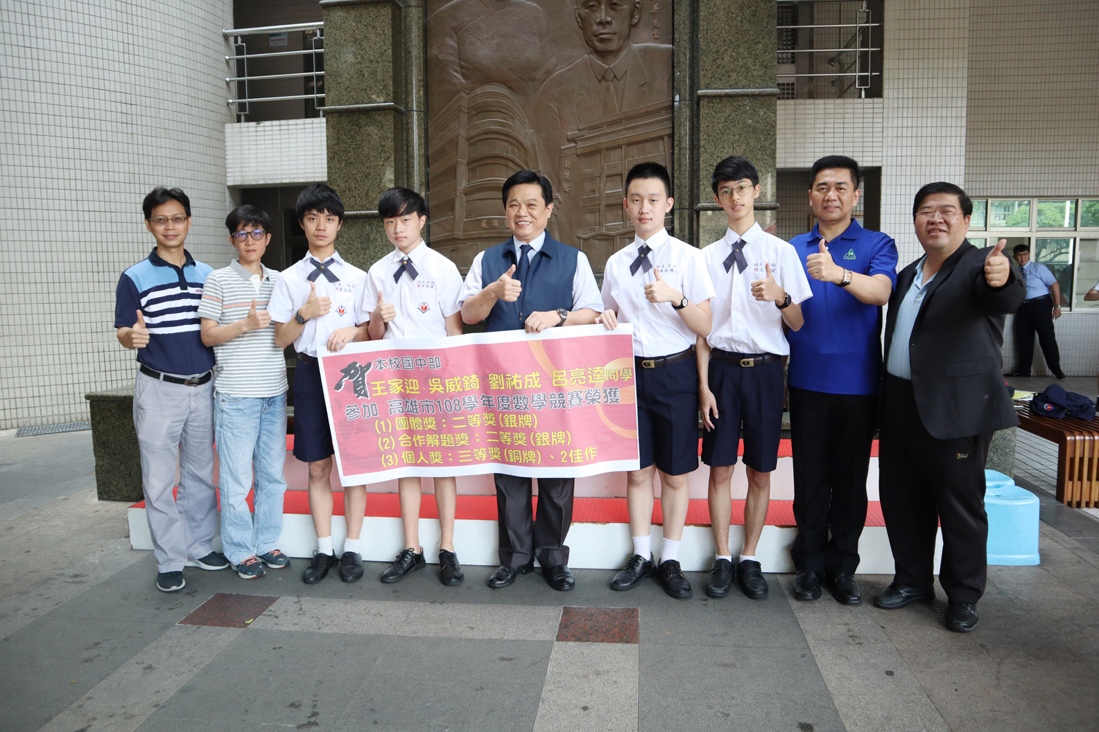 王家迎、吳威錡、劉祐成、呂亮逵同學參加高雄市108學年度數學競賽榮獲團體獎:二等獎(銀牌)、合作解題獎:二等獎(銀牌)、個人獎:三等獎(銅牌)、2佳作